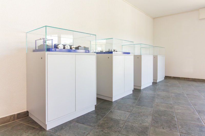 Das Foyer ist modern mit klaren Linien gestaltet. Drei beleuchtete Vitrinen in schwebender Optik, präsentieren Metalle sowie verschiedene Exponate. Zusätzlich sorgt die Wandverkleidung aus Eiche für eine Warme Note.