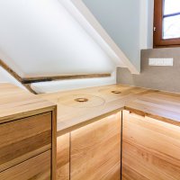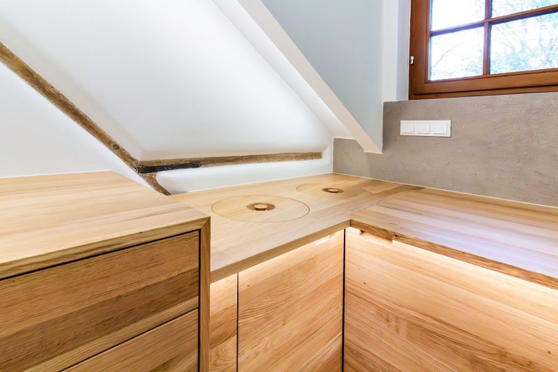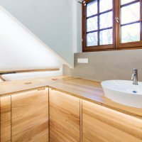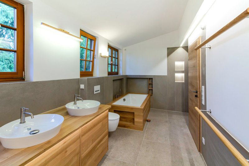 Die Einrichtung in massiver Eiche verleiht dem Bad eine besondere Wertigkeit und harmoniert perfekt mit der Betonoptik der Fliesen. Ebenfalls wurde die Badewanne in Holz eingefasst. Nischen in der Verkleidung bieten Platz für Handtücher und Co.